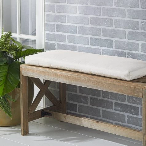 Add extra comfort to your porch or entryway bench with this Indoor/Outdoor Bench Cushion. Its natural color will coordinate with any existing decor. Made from: Polyester with polyfillMeasurements: 31-1/2″W x 11-3/4″LNotes: Imported
