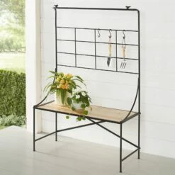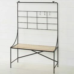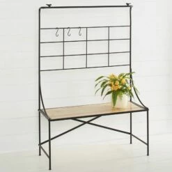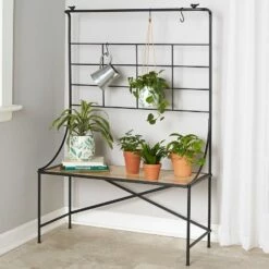 This Indoor/Outdoor Storage Shelf is the perfect addition to your home or garden. Little birds decorate the top corners. Display your plants from the 3 included S-hooks, or set them on the shelf or in the storage space underneath. Made from:Metal and woodMeasurements:39-1/4″W x 16-1/4″D x 59″HNotes:Assembly required; assembly hardware included