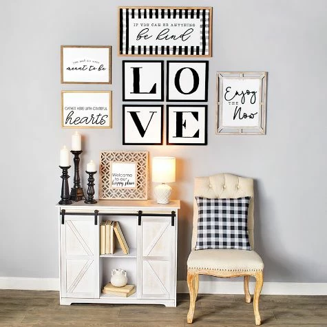 Surround yourself with the positive affirmations of this Inspirational Phrases Collection. The uplifting sayings on the various pieces complement each other, yet can work individually. The Grateful Hearts and Meant to Be Wall Art and are a wonderful pair that look great hanging together. The Enjoy the Now Wall Art features an intricately designed frame. Happy Place Framed Wall Art is bordered by a design of geometric shapes. Plaid Be Kind Wall Art features a border of buffalo checks. The 4-Pc. LOVE Sign Wall Art spells out the word “Love.” The Cross Hatch Textured Lamp requires a maximum 60-Watt bulb. Grateful Hearts Wall Art16-1/8″W x 12-1/8″LWood and MDFMeant to Be Wall Art16-1/8″W x 12-1/8″LWood and MDFEnjoy the Now Wall Art16″W x 20″LMDFHappy Place Framed Wall Art15-3/4″ sq.MDF and woodPlaid Be Kind Wall Art29-5/8″W x 15-5/8″LWood and MDF4-Pc. LOVE Sign Wall Art13-1/8″ sq., eachWood and MDFCross Hatch Textured Lamp8″ dia. x 14-1/2″HUL-ListedCeramic, cotton and linenAssembly required; assembly hardware included