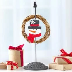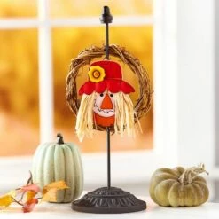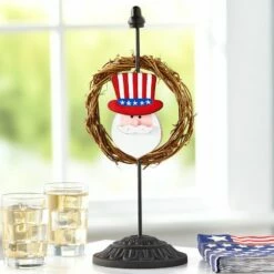 Celebrate the seasons with this Interchangeable Table Wreath with Stand. Simply swap out the icons as the year goes by. Perfect for a mantel or table. Made from: MDF, metal and rattanMeasurements: Stand, 12-5/8″LWreath, approx. 5-1/2″ dia. Icons include:- Scarecrow, 3-1/2″W x 4″L- Home, 4″W x 3-3/4″L- Uncle Sam, 2-3/4″W x 4-3/8″L- Snowman, 2-1/2″W x 4-1/2″L- Bunny, 4-1/2″W x 4-3/4″L