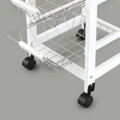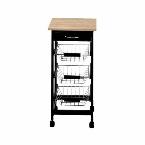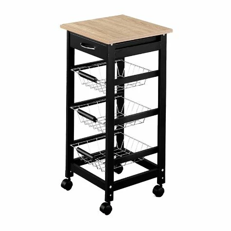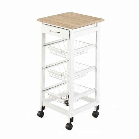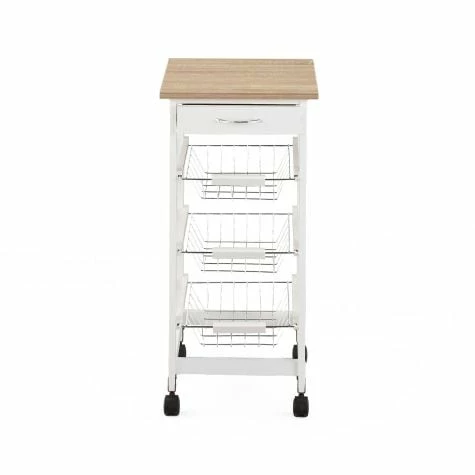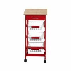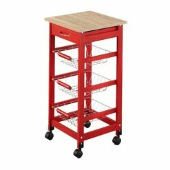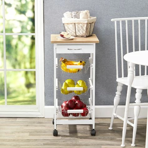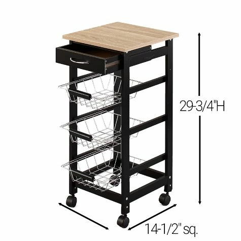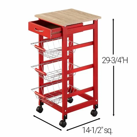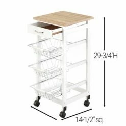 Add storage and work space to your kitchen with this Kitchen Cart with Shelving. It features three wire shelves that are removable, yet easily slide back into the cart. It also has a single drawer beneath the tabletop. Rolls around smoothly on four wheels. Made from: MDF, metal and woodMeasurements: 14-1/2″ sq. x 29-3/4″HNotes: Assembly required; assembly hardware included