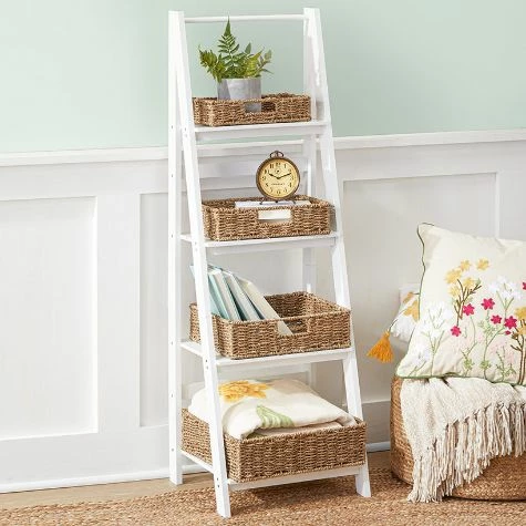 Add stylish storage to your living space with the Ladder Shelving Unit or Set of 4 Baskets. With 4 graduated shelves, the simple lines of the Ladder Shelving Unit create an attractive display that makes maximum use of your floor space. Complement the shelf’s design with the Set of 4 Baskets, which fold for easy storage. Set of 4 Baskets includes:- Small, 11″W x 5-5/8″D x 2-3/8″H- Medium, 12″W x 8″D x 3″H- Large, 13″W x 10-1/2″D x 3-1/2″H- X-large, 14″W x 13″D x 4″HSeagrass and metalLadder Shelving Unit15-1/2″W x 13-1/2″D x 46-3/4″HMDFAssembly required; assembly hardware included