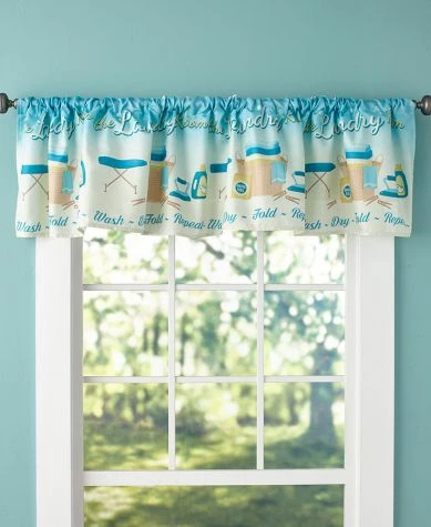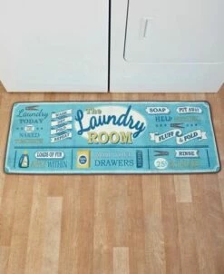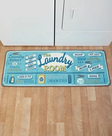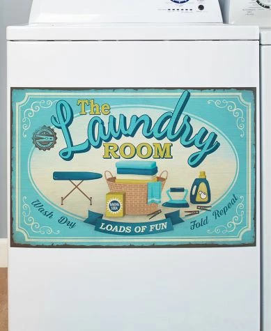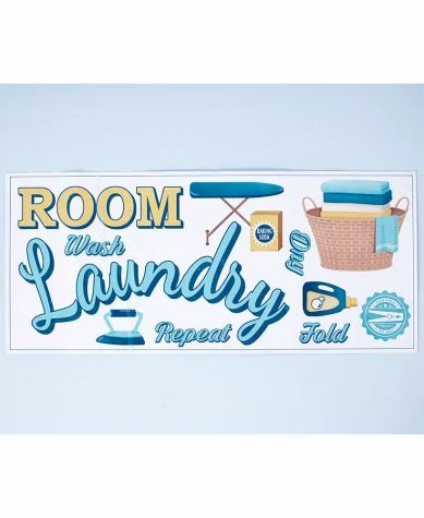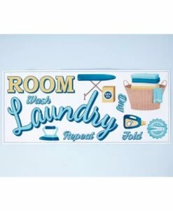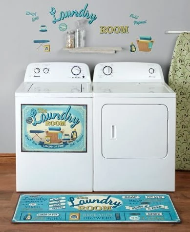 Break up the monotony of daily chores with this lively Laundry Room Collection. Each coordinating decor item features vivid artwork with laundry-themed sentiments that stand out. The Valance has a rod pocket for easy hanging. Wall DecalsRange from 3″W x 1-3/8″L to 19-1/8″W x 7″LPVCWashing Machine Magnet23″W x 17″LPaperNot for use on stainless steel Valance71″W x 14″LPolyesterMachine washImportedRug19-1/2″ x 52″Polyester, polyurethane and PVCImported