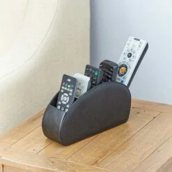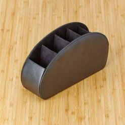 Store TV remotes, tech devices and cords in this attractive Leather-Look Remote Control Organizer. It features divided sections for different items. Looks great on a coffee table, end table, nightstand or any flat surface. Made from:Polyurethane, polyester, cotton, metal and paperboardMeasurements:8-3/8″W x 4-5/8″D x 2-3/4″HNotes:Imported
