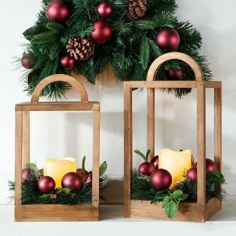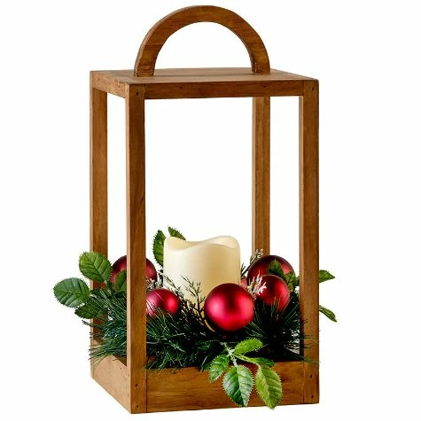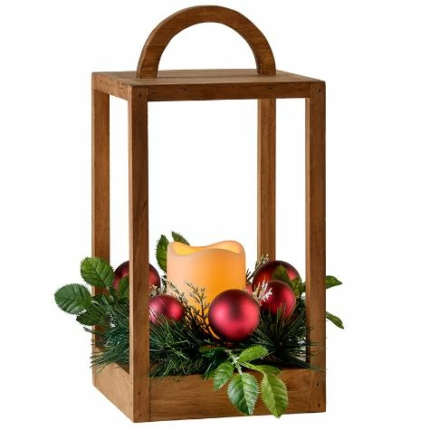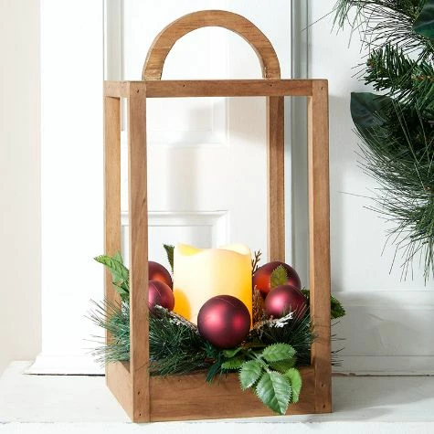 Brighten your home for the holiday season with this LED Lantern. It’s decorated with lush faux greenery and burgundy ornaments. The included LED candle mimics a real flickering flame and adds to the coziness of the season. Has a 6-hour timer and an on/off button. Made from:Wood, polyethylene, polypropylene and PVCMeasurements:12″ Lantern, 11″ sq. x 12″H14″ Lantern, 11″ sq. x 14″HNotes:Requires 3 “AAA” batteries