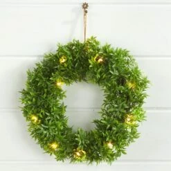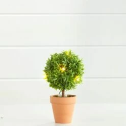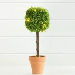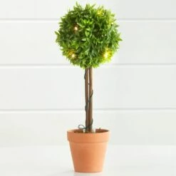 Brighten your home with this Lighted Faux Boxwood Topiary or Wreath. Each piece is battery operated for placement anywhere in your house. The Topiary makes a perfect centerpiece or it looks great displayed on any table. Available in 3 sizes. The Wreath can be used as decor all year long. Comes with a rope for hanging. 12″ Topiary5-1/2″ dia. x 12″H Requires 2 “AA” batteries Plastic and clay 18″ Topiary6-1/2″ dia. x 18″HRequires 2 “AA” batteries Plastic and clay 17″ Wreath17″ dia.Requires 2 “AA” batteries Plastic21″ Topiary7″ dia. x 21″HRequires 2 “AA” batteries Plastic and clay
