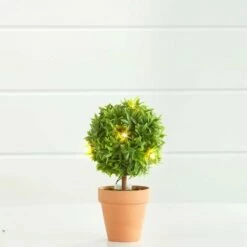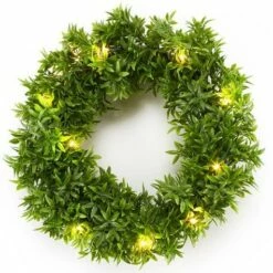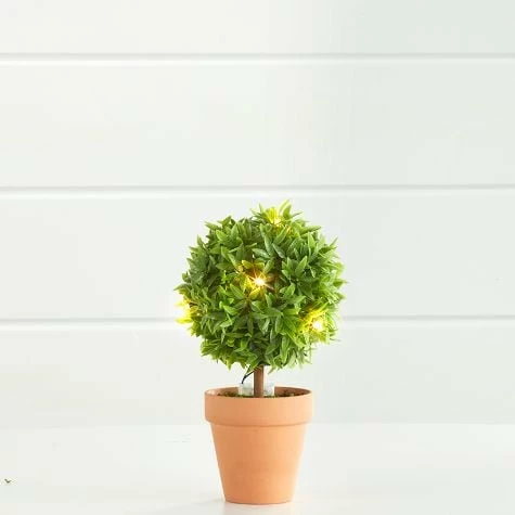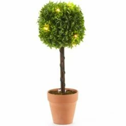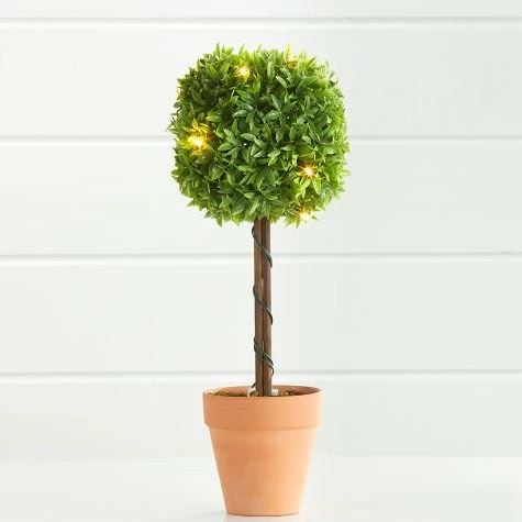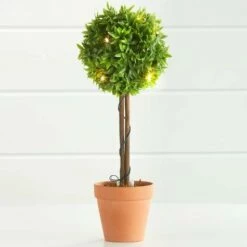 Brighten your home with this Lighted Faux Boxwood Topiary or Wreath. Each piece is battery operated for placement anywhere in your house. The Topiary makes a perfect centerpiece or it looks great displayed on any table. Available in 3 sizes. The Wreath can be used as decor all year long. Comes with a rope for hanging. 12″ Topiary5-1/2″ dia. x 12″H Requires 2 “AA” batteries Plastic and clay 18″ Topiary6-1/2″ dia. x 18″HRequires 2 “AA” batteries Plastic and clay 17″ Wreath17″ dia.Requires 2 “AA” batteries Plastic21″ Topiary7″ dia. x 21″HRequires 2 “AA” batteries Plastic and clay