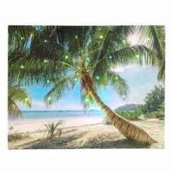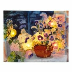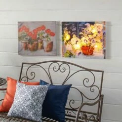 Decorate a wall of your porch, patio or deck with this Lighted Indoor/Outdoor Canvas Wall Art. These beautifully detailed works of art are designed to be hung outdoors. Made of UV-coated canvas wrapped around a wood frame. Made from: Wood and canvasMeasurements: 19-5/8″W x 15-3/4″LNotes: Requires 2 “AA” batteries Ready to hang