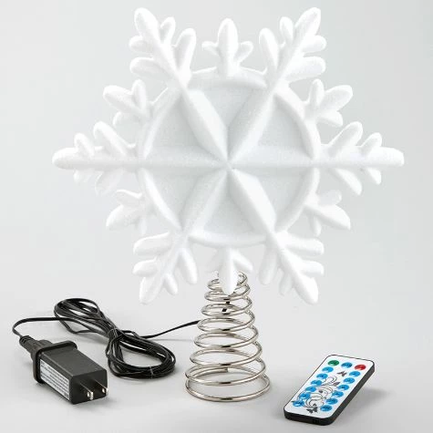 Top off your Christmas tree with this Lighted Snowflake Tree Topper. It features 10 color-changing light modes. Comes with a remote control to turn it on and off. Has a 4- or 6-hour timer. Made from: PlasticMeasurements: Snowflake, 10″ dia. x 1-3/4″DHolder, 2-1/2″ dia. x 5″HNotes:Snowflake plugs in Remote requires 1 button-cell battery