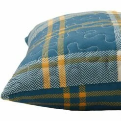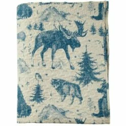 Bring a breath of fresh air to your bedroom with the Lodge Toile Quilted Bedding Ensemble. A new take on the classic lodge look, it features a repeating pattern of the Great Outdoors, including animals, trees and mountains. The quilts reverse to a blue, off-white and yellow plaid, that matches the accent pillow. Sham26″W x 20″LPolyester with polyfillMachine careImportedFull/Queen Quilt90″ sq.Polyester with polyfillMachine careImportedKing Quilt105″W x 95″LPolyester with polyfillMachine careImportedAccent Pillow16″ sq.Polyester with polyfillImported