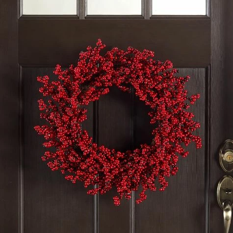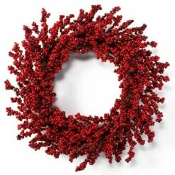Give an eye-catching look to your front door or a wall inside your home with this vibrantly colored Merry Berry Christmas Wreath. Its twisting twig design is made from natural rattan covered in faux red berries of differing shapes. Made from:Foam, rattan and metalMeasurements:22″ dia.