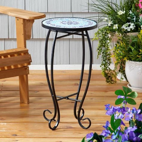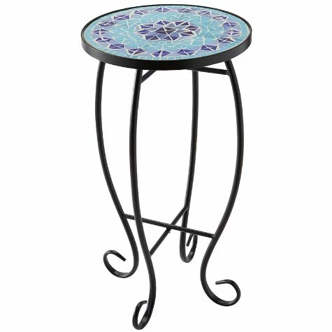 Add a touch of elegance to your surroundings with this Mosaic Accent Table. The inlaid glass top features a flower design in shades of blue. The sturdy crossed metal frame is made of black finished steel with smooth, rounded edges and curved legs. Weight capacity, 50 lbs. Weather resistant for indoor/outdoor use. Made from:Glass and metalMeasurements:12″ dia. x 23-1/2″HNotes:Assembly required; assembly hardware included