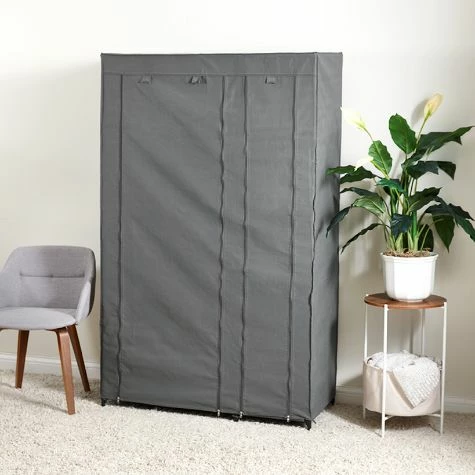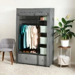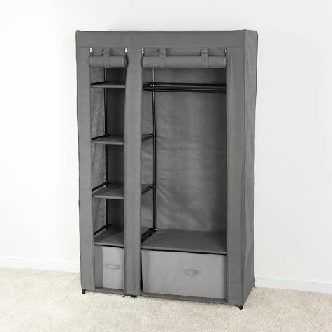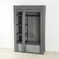 Create additional storage space in a bedroom, dorm room, craft room–even the garage with this wardrobe. It’s the smart, stylish organizer of your dreams. Offers a bar for hanging shirts and pants, 4 shelves for folded items, 2 drawers and an open area for hard-to-fit items. Made from: Polyester, metal and polypropyleneMeasurements: 41-1/4″W x 17-3/4″D x 67-1/4″HNotes: Assembly required; assembly hardware included