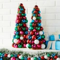 Add a pop of color to any spot in your home with this decorative Ornament Tree. A combination of shiny and matte ornaments in non-traditional Christmas colors are arranged in the shape of a tree. Bright, colorful and oh, so modern! Made from: PlasticMeasurements:16″ Tree, 7-1/2″ dia. x 16-1/4″H18″ Tree, 8″ dia. x 17-5/8″H