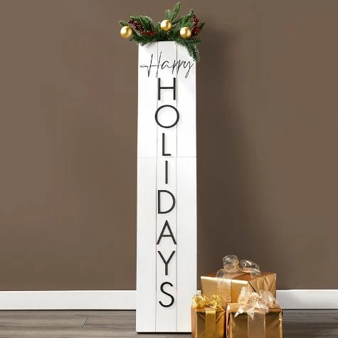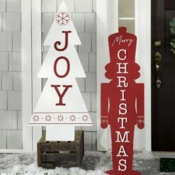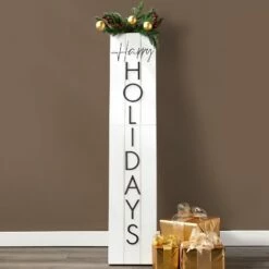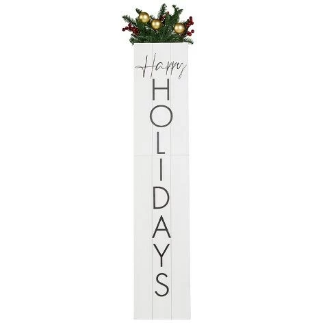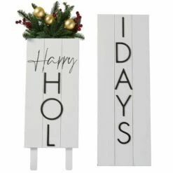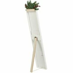 Add holiday decor to your front porch with this Outdoor Christmas Porch Leaner. It is trimmed with faux greenery, gold ball ornaments and red berries. Stands with the help of a kickstand. Weather resistant. Made from: MDF and plywoodMeasurements: 9-1/2″W x 54″LNotes: Assembly required; assembly hardware included
