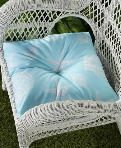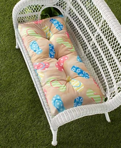 Bring the beach to your outdoor space with this Outdoor Cushion Collection. The Coastal design features an aqua background with white sea shells and starfish. The Flip-Flop design features a sand-like background with a colorful flip-flop pattern. Each design is available in 2 sizes. Single19″ sq. Polyester with polyfillImported Double43″W x 19″LPolyester with polyfillImported