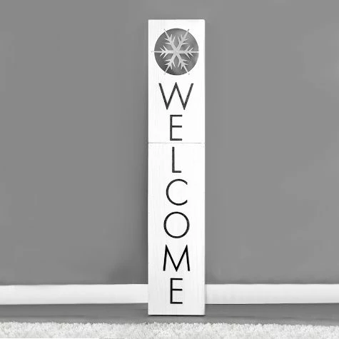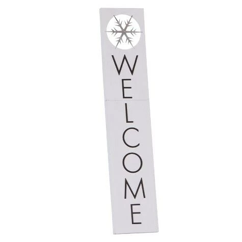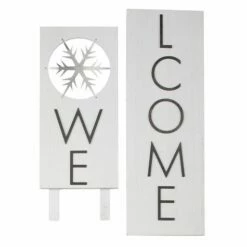 Welcome guests to your home during the holidays with this Outdoor Porch Leaner. It features “Welcome” written vertically down the center and a snowflake at the top. Has a kickstand in back to help it stay upright. Weather resistant. Made from: MDF, plywood and metalMeasurements: 9-1/2″W x 13″D x 47-1/2″HNotes: Assembly required; assembly hardware included