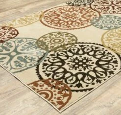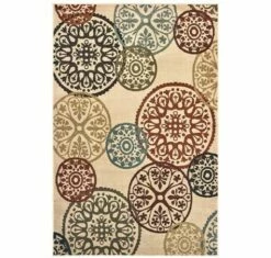Protect your flooring from foot traffic and add excitement underfoot with the Pendant Rug. Each rug features a medallion design in colors of deep red, soft rain blue, moss green and black coupled with warm neutrals. It’s highlighted with a gold frieze yarn to add texture and appeal. Rug pad recommended. Made from: PolypropyleneMeasurements: 3 ft. 3 in. x 5 ft.Notes: Made in the USA