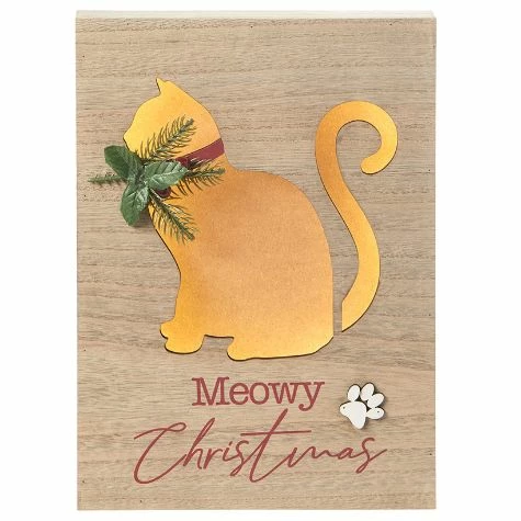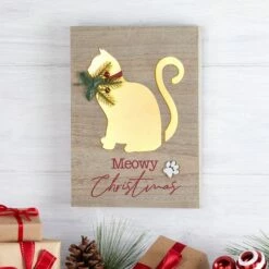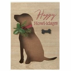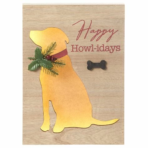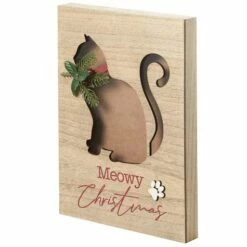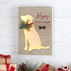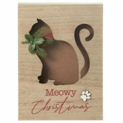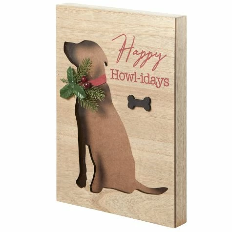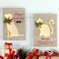 Display a sweet seasonal message from your pet with this Pet Lighted Wall Art. Dog choice reads, “Happy Howl-idays.” Cat choice reads, “Meowy Christmas.” Has a 6-hour timer and an on/off button. Made from: MDFMeasurements: 8-1/2″W x 1-1/4″D x 11-5/8″HNotes: Requires 2 “AA” batteries