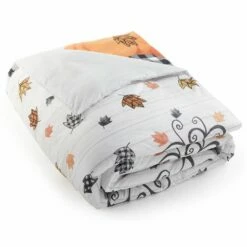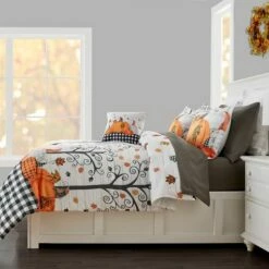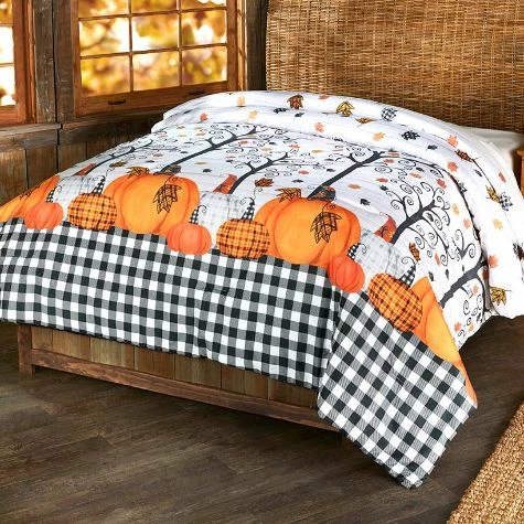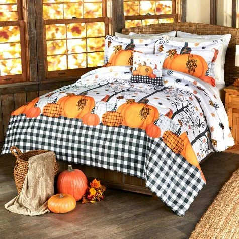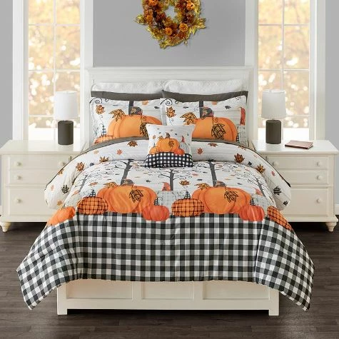 Give your bedroom a modern farmhouse look with this Plaid Pumpkin Bedroom Ensemble featuring seasonal checkered prints. Adding to the charm of the design are the trees with curling branches and falling leaves. Accent Pillow16″ sq.Polyester with polyfillImportedSham26″W x 20″LPolyester with polyfill Machine careImportedTwin Comforter66″W x 86″LPolyester with polyfillMachine careImportedTo achieve a more luxurious look, check measurements and buy up a sizeFull/Queen Comforter86″ sq. Polyester with polyfillMachine careImportedTo achieve a more luxurious look, check measurements and buy up a sizeKing Comforter101″W x 86″LPolyester with polyfill Machine careImported