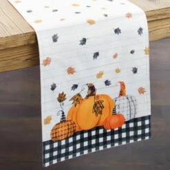 Add a harvest touch to your dining table with this Plaid Pumpkin Table Runner or Placemats. The design features a group of pumpkins on a black and white buffalo check tablecloth with leaves scattered around. Runner 13″W x 72″LPolyesterHand wash and line dryImportedSet of 4 Placemats18″W x 13″L, eachPolyesterHand wash and line dryImported