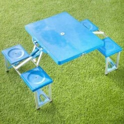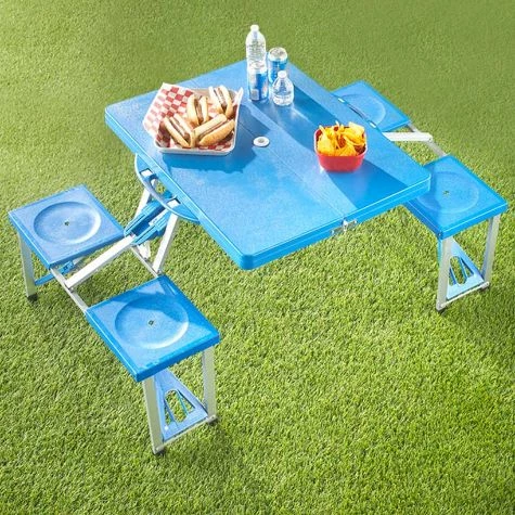 Up to four people can sit comfortably on this Portable Folding Picnic Table. Its compact size and ability to set up anywhere make it a must-have for your next camping trip, picnic at the park, beach, or even your own backyard. Sturdy and durable design has a locking frame. Includes a hole for your own umbrella. Made from: Aluminum, ABS plastic, polypropylene and steelMeasurements: Table, 33-3/4″W x 25-1/2″D x 26″HFolded, 33-3/4″W x 15″D x 4″HNotes: Weight capacity, 225 lbs. per seat and 40 lbs. for tabletopAssembly required; assembly hardware included
