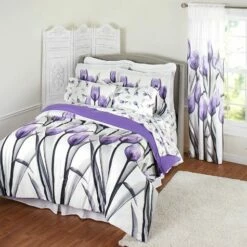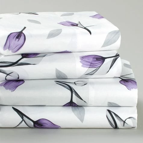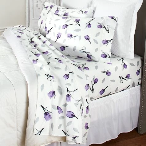 Add a touch of spring to your bedroom with this Purple Tulip Printed Sheet Set. It features an all-over print on a white ground. Fitted sheet fits mattresses up to 14″ deep. The King set comes with king-size pillowcases. Made from:PolyesterSet includes:- Flat sheet- Fitted sheet – 2 Pillowcases Care:Machine careNotes:Imported