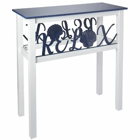 Let the calming message from this Relax Coastal Accent Table inspire your everyday living. With its distressed seashell accent and deep blue tabletop, this nautical piece is perfectly sized for almost any room or to use as an entryway table. Made from:MDF and metalMeasurements:31-1/2″W x 14″D x 32″H
