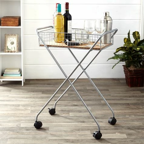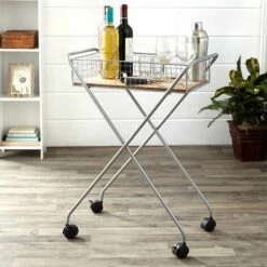 This Rolling Metal Basket Cart is ideal for entertaining! Use it in the living room as a bar cart or in the kitchen for your coffee maker and accessories. The wire basket at the top has a wooden bottom and sides that are high enough to prevent items from falling off. Made from: Metal and MDFMeasurements: 22″W x 12-1/2″D x 30″HNote: Assembly required; assembly hardware included