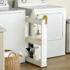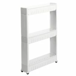 Add storage space in tight spots. The slim cart features 3 or 5 tiers for storing almost anything. Great for the kitchen, bathroom or laundry room. Four wheels make it easy to maneuver. Made from: Polypropylene and PVCMeasurements: 3-Tier, 4-3/4″W x 21-1/2″D x 30-1/2″H5-Tier, 4-7/8″W x 21-1/2″D x 57″HNotes: No-tool assembly required; assembly hardware included