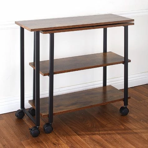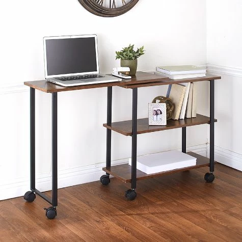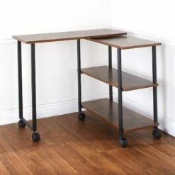 Ideal for a home office, this Rotating L-Shaped Desk can be set up in different configurations. All the legs are on wheels for easy movement. The desk has 2 sections, one with 2 shelves below the desk top and the other open beneath. Roll out the shelf section to a 90° angle for an L-shaped desk or roll it straight out for a longer desk. You can also tuck the section with shelves under the open section to create a bookshelf. Made from: Metal and chipboardMeasurements: 31-1/2″W x 11-7/8″D x 26-3/4″HNotes: Assembly required; assembly hardware included