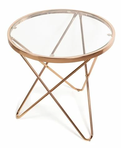 Add a touch of elegance to your living room with this Round Glass Top End Table. It features a contemporary rose gold metal stand with a clear tempered glass top for durability and safety. Hairpin legs give it an airy feel. Made from: Metal and glassMeasurements: 21-1/2″ dia. x 22″HNotes: Assembly required; assembly hardware included