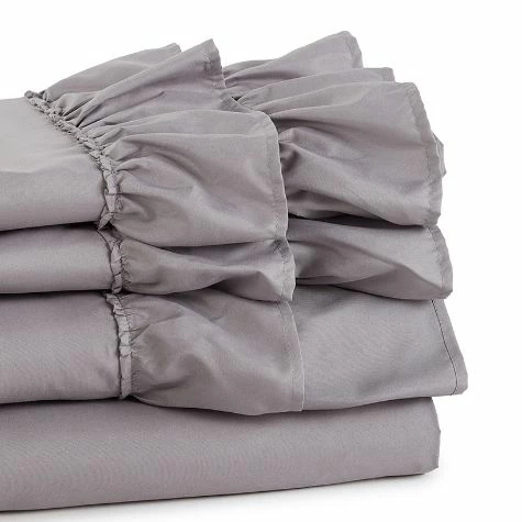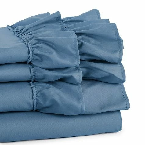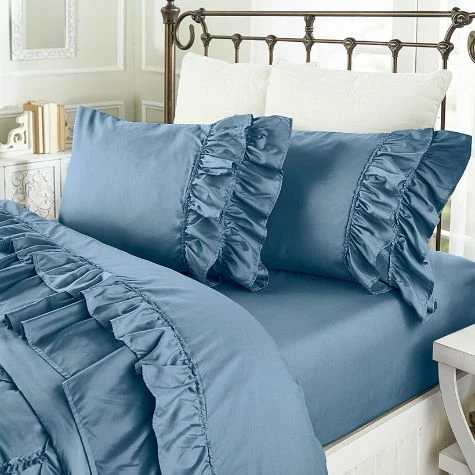 This Ruffled Sheet Set lends a unique touch to your bed. All sizes of fitted sheets fit up to a 14″ deep mattress. King set includes king-size pillowcases. Made from:Polyester Set includes:- Flat sheet- Fitted sheet- 2 Pillowcases (1 with Twin)Care:Machine careNote:Imported
