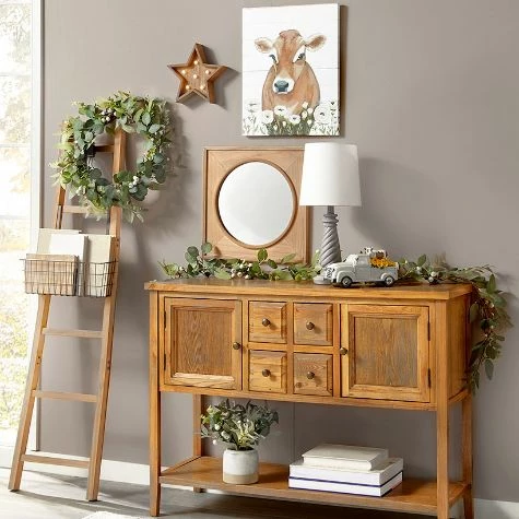 Accent your home sweet home with decor items from this Rustic Cottage Collection. The collection includes a white berry Floral Arrangement, Light-Up Truck, Lighted Wooden Star, the charming Sweet Cow Art, a Lighted Garland or Wreath, and a Square Frame with Mirror. Floral ArrangementRequires 2 “AA” batteries10-3/4″ dia. x 15-1/2″HPolyester, ceramic and plasticLight-Up TruckRequires 2 “AAA” batteries10-1/4″W x 4-3/4″D x 6-1/2″HCold cast ceramicLighted Wooden StarRequires 2 “AAA” batteries9-1/2″W x 2-1/4″D x 10″HMDF and metalReady to hangSweet Cow Art16″W x 20″LMDF and canvasReady to hangLighted GarlandRequires 2 “AA” batteries72″LPolyester, plastic and metalLighted WreathRequires 2 “AA” batteries22″ dia.Polyester, plastic, metal and foamSquare Frame with Mirror18-1/8″ sq.MDF and glassReady to hang