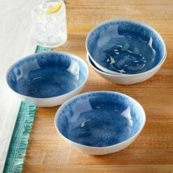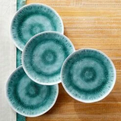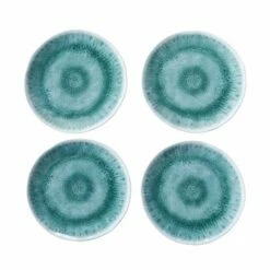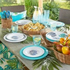 Set a gorgeous tablescape with this Seaside Tabletop Collection. Each piece features serene, water-inspired colors. Worry-free melamine dishes and acrylic drinkware let you use these pieces for everyday meals or when entertaining on the patio. Reactive Green Oval Platter16”W x 11-7/8”LMelamineNot for use in microwaveSet of 4 Blue Bowls28 oz., eachMelamineNot for use in microwaveSet of 4 Green Salad Plates9” dia., eachMelamineNot for use in microwaveSet of 4 Blue Dinner Plates11” dia., eachMelamineNot for use in microwaveSet of 4 Double Old Fashioned Cups11 oz., eachAcrylicTop rack dishwasher safeSet of 4 Tumblers15 oz., eachAcrylicTop rack dishwasher safe