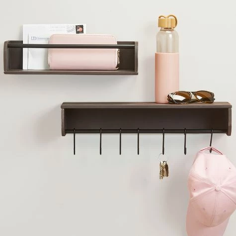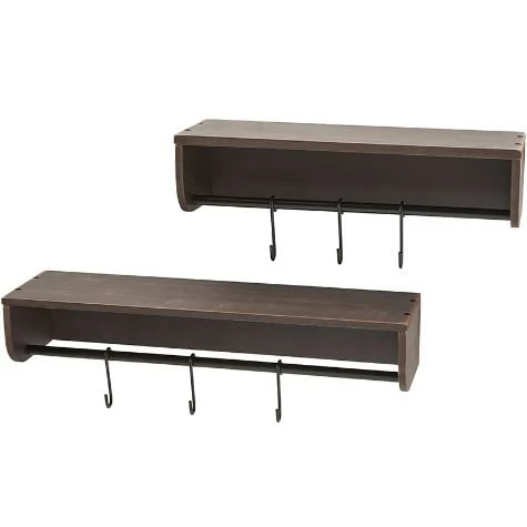 Hang this Set of 2 Reversible Wall Shelves with Hooks nearly anywhere in your home for versatile storage. Displayed one way, the shelf acts as a cubby to hold items. Turn it upside down to use the hooks for hanging lightweight items such as jewelry or mugs. Includes 7 removable hooks. Small shelf has 3 removable hooks while the large shelf has 4. Made from:MDF and metalSet includes:- Small, 15″W x 4-1/2″D x 4″H- Large, 19″W x 4-1/2″D x 4″HNotes:Assembly required; assembly hardware included