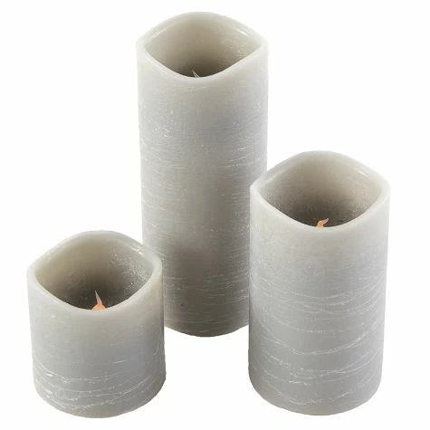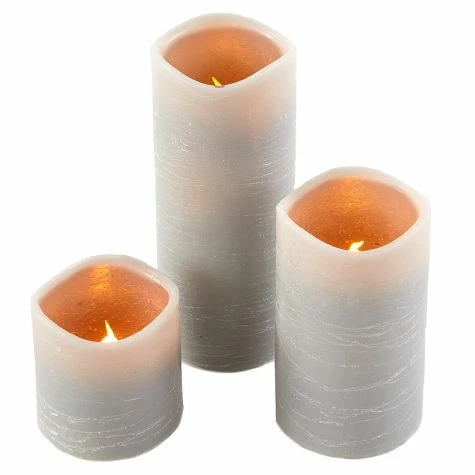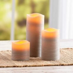 Enjoy a calm, relaxing ambiance with this Set of 3 6-Hr. Flameless Timer Candles. It features a timer that shuts off after 6 hours. Made from:Plastic and waxSet includes:3″ dia. x 3″H3″ dia. x 5″H 3″ dia. x 7″HNotes:Each candle requires 3 “AAA” batteries