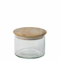 Organize items in your pantry or kitchen cupboards in this Set of 3 Canisters with Wood Lids. These canisters can also be used to organize bathroom, laundry room or home office accessories. They’re made of clear glass so you can see what’s inside. Made from:Glass, wood and siliconeSet includes:- Small, 4″ dia. x 3″H- Medium, 4″ dia. x 4-7/8″H- Large, 4″ dia. x 6-5/8″H