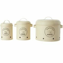 Store vegetables, while enhancing your farmhouse decor with this Set of 3 Farmhouse Produce Canisters. The large canister is designed to hold potatoes, the medium one for onions and the small one for garlic. They can be placed on any countertop or pantry shelf. Made from: MetalSet includes:- Small, 4-5/8″ dia. x 7″H- Medium, 6-3/4″W x 5-5/8″D x 7-3/4″H- Large, 10-1/4″W x 9-3/8″D x 8-1/2″H