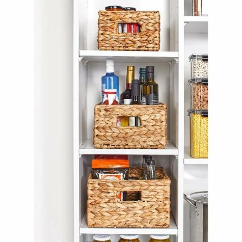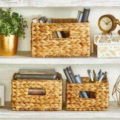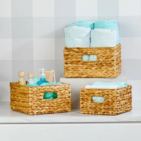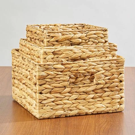 Use this Set of 3 Water Hyacinth Nesting Baskets to store many different items around your home. Handles on these open design baskets make them easy to move from place to place. When not in use, the set nests for compact storage. Made from: Water hyacinth and steelSet includes:- Small, 9″ sq. x 6″H- Medium, 10-1/2″ sq. x 6-1/2″H- Large, 12″ sq. x 7″H