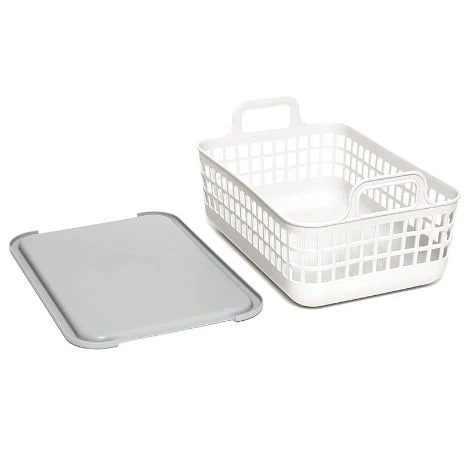 This Set of 2 Stackable Baskets with Lids is perfect for storing different items around your home. Lids help secure the contents. Includes handles for easy carrying. Made from:PolypropyleneMeasurements:9-1/4”W x 13”D x 6-3/8”H, each