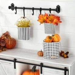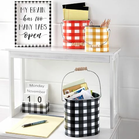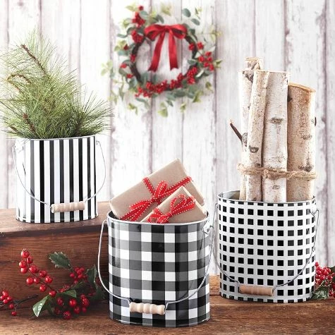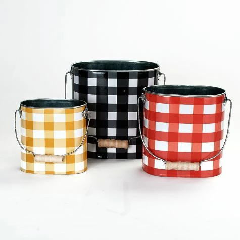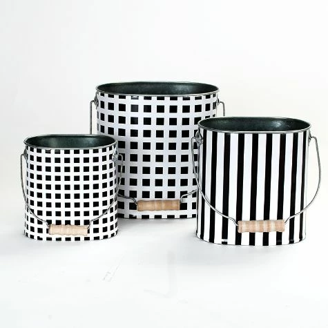 Accent your home with this Set of 3 Decorative Metal Buckets. Each set includes a small, medium and large bucket. The Multicolor set features black, red and yellow checks, while Neutral features geometric patterns. Fill them with your own faux flower arrangements, grasses, pumpkins or more. Made from: Metal Set includes: – Small, 5″W x 3-1/4″D x 5″H- Medium, 6″W x 4-3/8″D x 6″H- Large, 7″W x 5″D x 7″H
