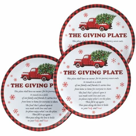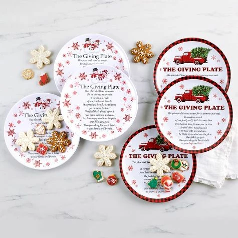 Start a tradition of generosity with this Set of 3 Melamine Giving Plates. The idea is to fill a plate with homemade treats and give it to a family member or friend. That person fills it with their homemade goodies and passes it on, and so on. A poem is printed on the plate describing the tradition. Using your own permanent marker, you could write your name and date on the back of each to track the plate’s travels. Made from:MelamineMeasurements:12″ dia. x 7/8″H, eachCare:Not for use in microwaveHand wash recommendedNotes:”This plate shall have no owner for its journey never ends. It travels in a circle of our family and friends. It carries love from home to home for everyone to share. The food that’s placed upon it was made with love and care. So please enjoy what’s on the plate, then fill it up again. Then pass along the love it holds to your family and friends.”