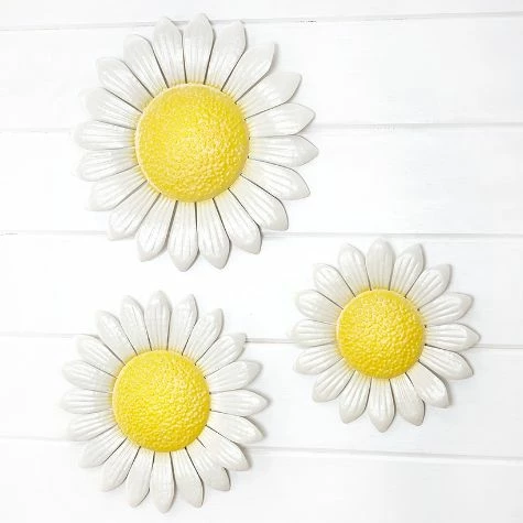 Spread a little “sunshine” inside your home with this Set of 3 Metal Wall Flowers. They may also be displayed on a covered porch. The center and petals of each flower are embossed to add texture and depth. Made from: MetalSet includes:- Small, 12″ dia.- Medium, 14-1/4″ dia.- Large, 16-1/2″ dia. Notes: Ready to hang