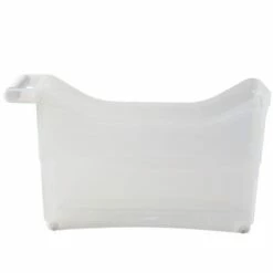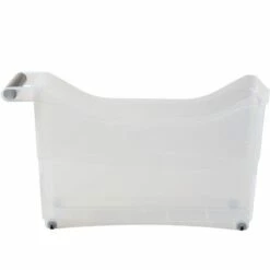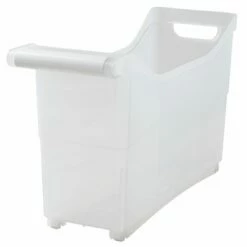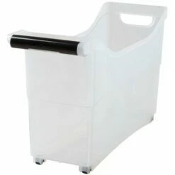 Organize your bathroom and kitchen cabinets, pantry, closets and more with a Slim Rolling Cabinet Storage Bin. The large, clear compartment has 4 wheels and 2 handles, making it easy to pull out. Made from:PolypropyleneMeasurements:6″W x 18-1/4″D x 10-1/2″HNotes:4 Bins shown