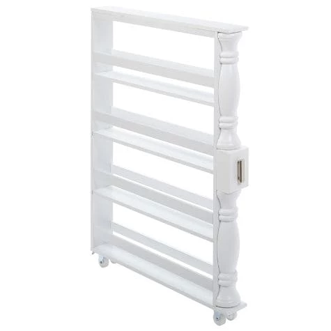 Get maximum kitchen storage in a minimum amount of space with the Slim Rolling Can and Spice Rack. At just 3-1/2″ wide, it fits between cabinets, appliances and in other narrow spaces. Wheels for easy mobility. Open shelves hold soda cans, spice jars and more. Made from:MDFMeasurements:3-1/2″W x 25-1/4″D x 34-1/4″HNotes:Assembly required; assembly hardware included