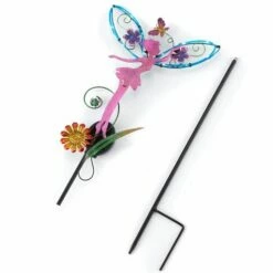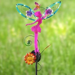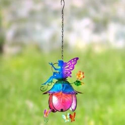 Add a magical, whimsical touch to your yard with the Solar Fairy Collection. The Stake features a fairy with lighted wings. The Hanging Light is a glass-petaled flower with a warm white LED light glowing inside and a fairy sitting on top. Stake11-5/8″W x 2-1/8″D x 36-1/8″H, including the 4-5/8″ ground stakeMetal and plasticHanging Light7″W x 6-1/4″D x 12″H, with a 7-1/2″L chainMetal and glass