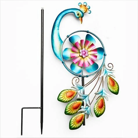 Add a splash of vibrant metallic color, movement and light to your yard with this Solar-Lighted Bird Spinner. This double-layer spinner features 12 cool white, blinking solar lights. Stake comes apart for compact storage. Made from: MetalMeasurements: Approx. 12″W x 2-3/8″D x 41″H, including the 4-3/4″ ground stakeNotes:On/off switch