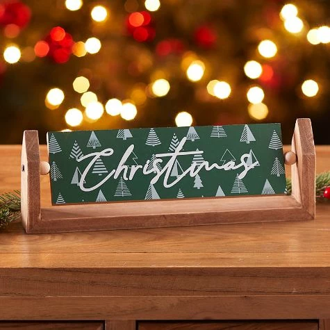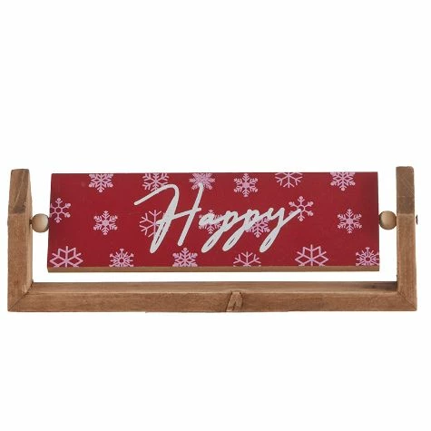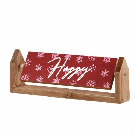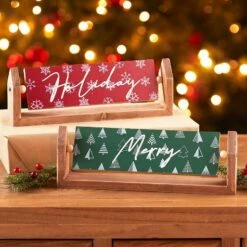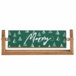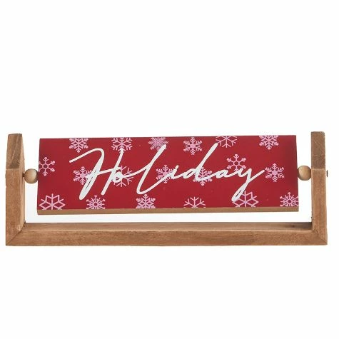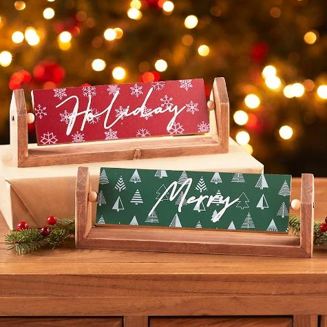 Accent your desk or kitchen countertop for the holiday season with this Spinning Double-Sided Sign. You spin the sign to read both words of a traditional holiday greeting. The Green sign features a tree pattern with “Merry” on side 1 and “Christmas ” on side 2. The Red one has a snowflake pattern that reads “Happy” on one side and “Holiday” on the other. Made from:MDF and woodMeasurements:9-7/8″W x 1-1/2″D x 3-3/8″H