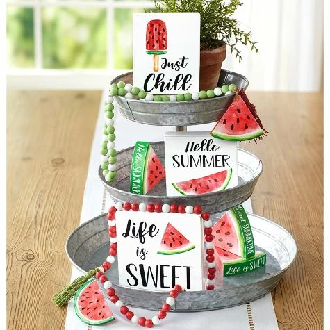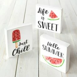 Decorate for the season with these Summertime Watermelon Decor Accents. The Set of 3 Sentiments all look like slices of watermelon standing on their own. They read, “Life Is Sweet,” “Hello Summer” and “Sweet Summertime.” The Set of 3 Wall Hangings features box signs inscribed with the same sentiments except “Just Chill” replaces “Sweet Summertime”. The Set of 2 Beads are loops of decorative beads that make great additions to your displays. They feature light green, white and pink beads, as well as watermelon slice-shaped beads. Set of 3 Sentiments19-1/2″W x 10″D x 2-1/2″H, eachMDFSet of 2 Beads36″L, eachWood and MDF Set of 3 Wall Hangings includes:- Life Is Sweet, 12″ sq. x 1″H- Just Chill, 5″W x 7″D x 1-3/4″H- Hello Summer, 6″ sq. x 1-3/4″HMDF